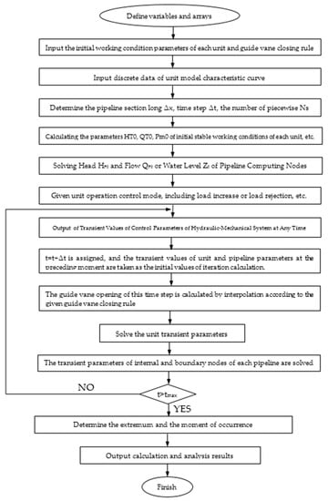 In the previous sections, the governing equation of hydraulic transition process of hydropower station was derived, and the boundary conditions of pump turbine, impedance surge chamber and bifurcation pipe were defined. For a better understanding of the numerical simulation, the calculation process is shown in Figure 4.