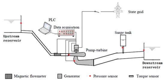 Pumped storage power station is the largest, most economical, and most mature energy storage technology at present. Therefore, this technology is being rapidly developed and applied. At the same time, there are a series of technical and economic problems to be solved. Mitani et al. proposed a new annual analysis method for thermal power generating units and pumped storage units, and evaluated the large-scale introduction of renewable energy [1]. Sankaramurthy et al. proposed a flower pollination algorithm for mitigating power system congestion, and economic analysis of the cost of alleviate congestion before and after the pumped storage device was added to the power system [2]. Trivedi et al. measured the transient pressure of a prototype Francis turbine during the transition from emergency shutdown to total load rejection. The variables, such as head, flow rate, and pressure at different positions, were analyzed in detail. Under the unstable condition, the maximum amplitude of unsteady pressure fluctuation in the turbine was observed. Such high amplitude and unsteady pressure fluctuation will affect the working life of the turbine [3,4]. He et al. analyzed the transient characteristics of the pump turbine in the start-up process by using the three-dimensional full flow channel numerical simulation method and discussed the relationship among pressure pulsation, mechanical vibration, and the dynamic stress of the runner. Hydraulic excitation has a significant effect on the dynamic stress and pressure pulsation of the runner [5]. Zhao et al. established a full flow channel model for a certain type of pump turbine, simulated the flow characteristics in the flow channel of the turbine using CFD technology, analyzed the pressure pulsation in the flow channel of the turbine, and discussed the source and mechanism of the pressure pulsation [6]. Yu et al. proposed a new closing law, which combines guide vane closure with main intake valve closure. The closing law can reduce the maximum pressure in spiral case and the maximum speed of runner and increase the minimum pressure in draft tube during transition [7]. Rezghi et al. carried out a numerical simulation on the interaction effect of two parallel units in the instability zone under the condition of conventional load rejection in a unit pumped storage power station with one-tube, two-unit [8]. Yu et al. established a mathematical model of hydropower station with multiple turbines sharing a hydraulic system, and studied the output change and dynamic characteristics of the turbine under the action of hydraulic disturbance [9]. Aiming at the problem of non-linear seepage in high-head pumped storage power station, Hu et al. established a non-linear seepage numerical model and applied it to the seepage analysis of the surrounding rock of the hydraulic tunnel of Yangjiang pumped storage power station [10].