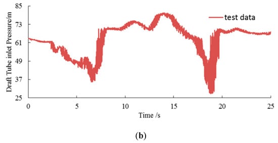 The test was carried out by means of electrical signal measurement. Under the set test conditions, the signals of spiral case pressure and draft tube inlet pressure were collected in real time by using the mechanical condition monitoring system CSI2600 of Emerson Process Control Co., Ltd.