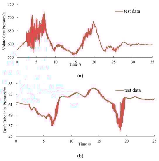 Figure 8 shows the image of spiral case pressure and draft tube inlet pressure after filtering. Considering that the pressure curve after denoise filtering contains fluctuating pressure, the time-averaged and pressure fluctuation value of water hammer pressure should be extracted by smoothing filtering. In this paper, the five-spot triple smoothing method was used to deal with the spiral case pressure and the draft tube inlet pressure contained pulsating pressure values [19].