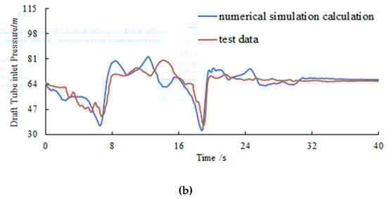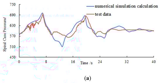 As seen from Figure 9, after filtering and smoothing, the numerical simulation results were in good agreement with the experimental results. The spiral case pressure was concerned with the positive pressure extremum, while the draft tube inlet pressure was concerned with the negative pressure extremum. Although the numerical simulation results of draft tube inlet pressure in Figure 9b deviated from the measured data, which may be related to the turbulence of the flow pattern in the draft tube during the load rejection [20], the minimum value of the calculated results did not show a large deviation. Table 3 shows that the positive pressure extremum of spiral case and the negative pressure extremum of draft tube inlet are in good agreement with numerical simulation results. Hence, the accuracy of numerical simulation results is reliable.