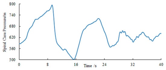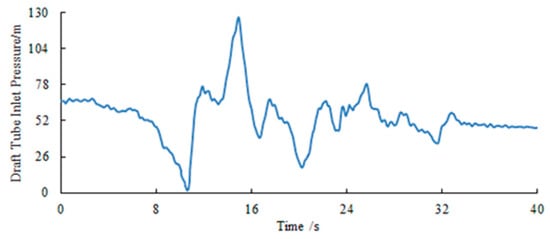 According to the numerical simulation calculation, the pressure control condition of the spiral case is that four units load rejection at the same time, the maximum pressure occurred in unit 1. The pressure control condition of the draft tube inlet is as follows: firstly, units 1, 2. and 3 load rejections are at the same time; secondly, unit 4 load rejection is after 6.2 s. The minimum pressure occurred in unit 4. The pressure extreme process line of the spiral case in the pressure control condition is shown in Figure 10. The pressure extreme process line at the draft tube inlet in the condition of successive rejection (6.2 s) is shown in Figure 11. The pressure extreme value was corrected using formula (14), and the results are shown in Table 7.