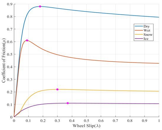 According to the magic formula (Tire–Road Interaction), which was firstly proposed by Pacejka [10], the relationship between the longitudinal wheel slip ratio and the friction coefficient of the road is shown in Figure 1 [14,15]. Several key points of these typical road conditions are based on Figure 1, and are summarized and shown in Table 1.