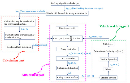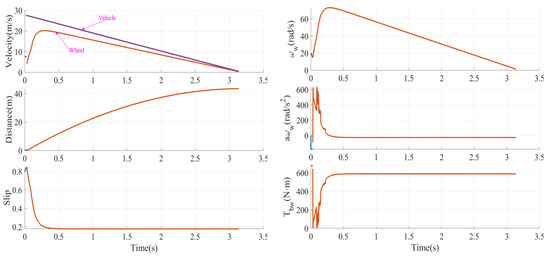 In the straight-line case mentioned in Figure 2, every single wheel operates under the same situation. We select the front left wheel as an example to show the control details, for which the control flow is shown in Figure 3. The main operating principle is to control the vehicle to approximate the optimal wheel slip ratio of different road conditions within the controllable range of the slip ratio. The wheel braking torque , which is the output variable of SMWSC, mainly works on adjusting the wheel angular velocity to control the wheel slip ratio in an optimal changing trend during the SMWSC control period for vehicle braking [21,22].