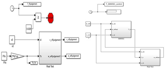 Firstly, select the front left wheel as an example to build the real test module. Before SMWSC starts, the vehicle is driven with the road condition automatic detection module under a fixed braking force during a short calculation period s, shown in the left of Figure 4. This short calculation period is the vehicle’s earliest braking stable time obtained through a short training [28] on different road conditions with different initial braking velocities. After the calculation part of this module, shown in Figure 3, the road condition is determined then given to the ABS control module. The outputs of the road condition automatic detection module are , and , which are also considered as the input variables of the ABS controller’s input variables.