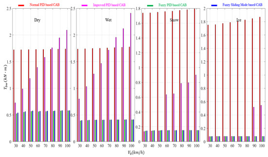 - The braking torque of the improved PID-based CAB is different on different road conditions with different initial vehicle velocities. Moreover, the improved PID-based CAB needs larger braking torque compared to the two robustness CABs, on almost all four kinds roads with different initial vehicle velocities.