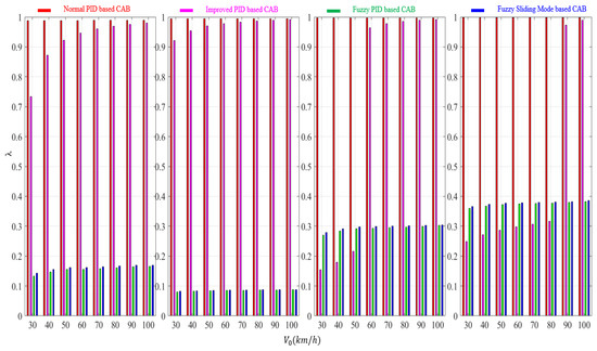 This subsection first gives a comparison of the braking control performance of the vehicle with different types of ABS controllers: Normal PID-based CAB, improved PID-based CAB, fuzzy PID-based CAB and fuzzy sliding mode PID-based CAB. PID parameters used in these four CABs are set as the same values and shown in Table 2. Considering that using the real-time data will largely increase the complexity of the analysis and using average data can largely show the trend of data, the comparison data used in the following three figures are all average values.