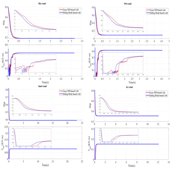 - The wheel slip ratios of the two robustness CABs are small enough on all the four road conditions with all initial vehicle velocities compared with the other two pure PID-based CABs. In addition, the wheel slip ratios of these two robustness CABs are around on dry and wet roads and around on snow roads and ice roads; these slip ratios are all closer to the optimal slip ratio of different roads.