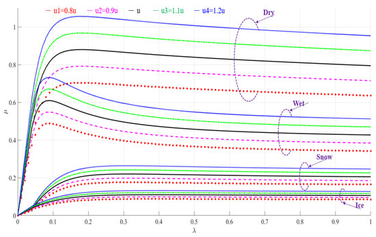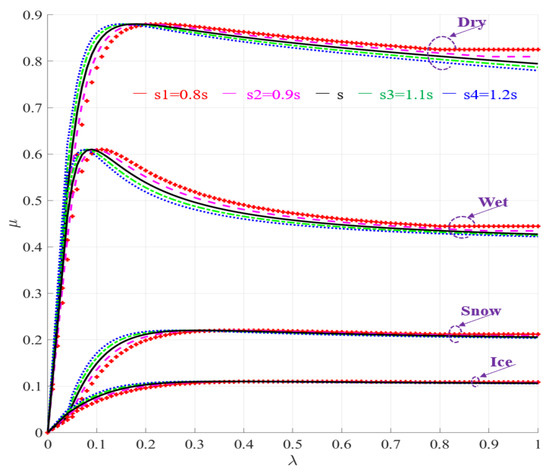 Obviously, the change of has a little bit of an influence on control performance, especially on snow and ice roads. It can also be seen from Figure 1, that even a slight change of can have a large difference on . In other words, the ABS controller needs to increase the modulation intensity to a large extent to meet the trend of change. Therefore, this proposed ABS controller’s robustness ability to handle this disturbance is not strong enough.