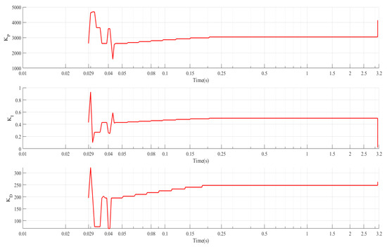 Actually, the fuzzy control module and PID control module are considered as the compound fuzzy PID controller. The output variables of the fuzzy controller, , and , are then put through the PID control module and become the final output variables of the fuzzy PID controller, shown in Equation (10).