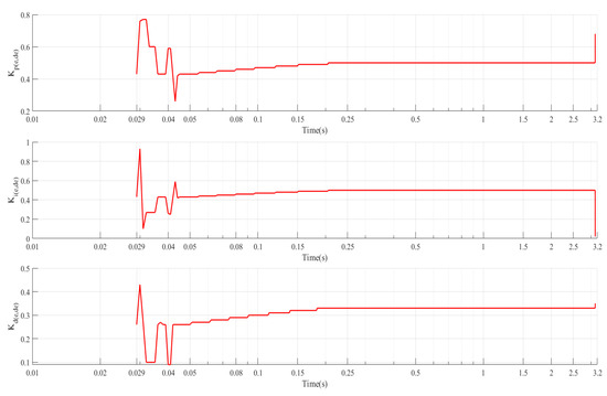 Figure 11 shows the changes in integral action parameters inside the fuzzy PID control module. As all know, the parameters of the conventional PID controller are fixed after the controller’s design; however, PID parameters are designed with the adaptive capability after being combined with the fuzzy control part. Figure 12 shows the adaptive changes of the wheel slip ratio error and ; besides, Figure 13 shows the output parameters of the fuzzy control module.