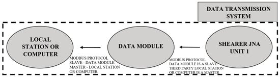 Figure 3 presents a diagram of the shearer’s data transmission system. Shearer data are transmitted from the JNA Unit 1 to the Data Module Unit. The data module converts the data received from the shearer’s JNA Unit 1 into the Modbus protocol. The data is then transmitted to the third-party modem (MASTER). The third-party modem transmits the data from the shearer to the third-party equipment located in the gate end.
