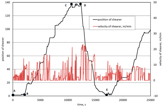 Five characteristic points were marked on the course of the shearer’s position on the longwall (relative to the section number of the powered face support) (Figure 5). The longwall being analysed was mined on a unilateral basis, which is illustrated by the marked points. Section AB denotes the movement of the longwall shearer during sumping (the beginning of excavation). Section BC denotes the rock mass excavation phase, Section CD refers to the manoeuvring time of the longwall shearer at the end of the longwall, while Section DE denotes the reverse travel of the shearer.