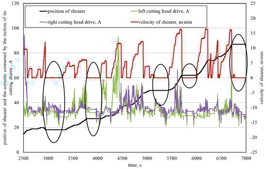 Figure 6 shows a small number of the registered time periods for the operational parameters of the longwall shearer. These parameters include the advance speed of the longwall shearer, its position on the longwall and the currents consumed by the motors of its cutting drums. The figure indicates selected and noticeable stoppages in the functioning of the longwall shearer, which were used to analyse its availability. This is the excavation phase of the shearer (Section BC).