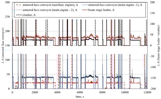 Time periods of the currents in the motors of the armoured face conveyor, beam stage loader and crusher. J, the currents consumed by the motors of machines.