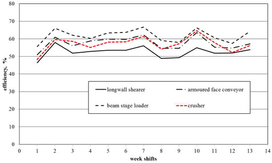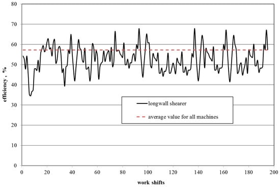 The parameter that had a decisive influence on the effectiveness of the analysed machines was their availability. The influence of this was particularly noticeable in the case of the longwall shearer (Figure 9). The particular working shifts were characterised by large differences in the shearer’s availability, which translated into the shearer’s highly diversified effectiveness (Table 3). Within the time period under analysis, the highest values of the effectiveness indicator were registered for the main haulage conveyor. Its average value for the period in question exceeded 60%, which should be regarded as a good result.