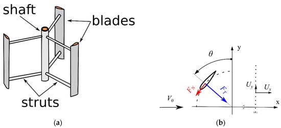 A wind turbine with a vertical axis of rotation (vertical-axis wind turbine—VAWT) consists of several curved or straight blades that drive the generator shaft. By using the lift force to generate the torque, the tangential velocity of the blades can be larger compared to the wind speed. The silhouette of a wind turbine with straight blades (H-type rotor) is shown in Figure 1a. The rotor shown in this drawing has additional elements that attach the blades to the shaft and transfer the torque to the rotor shaft. These elements are called struts and they are usually profiled using symmetrical airfoils to minimize additional aerodynamic drag. In the case of the rotor investigated in this work, its blades also have symmetrical airfoils NACA0018. A lot of commercial wind turbines have symmetrical airfoils; they provide high efficiency in the upwind part of the rotor.