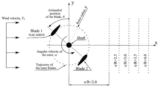 Numerical experiments have been performed for one tip speed ratio of 4.5. The rotor rotational velocity was 800 rpm and the free stream velocity, V0, was 9.3 m/s. For given rotor operating conditions and for geometric parameters, the Reynolds number of the blade was 170,000. The conceptual model of the tested rotor is shown in Figure 2. This figure also shows the positions of the measuring points behind the rotor in which the velocity was collected. Other geometrical dimensions of the rotor are shown in Figure 3.