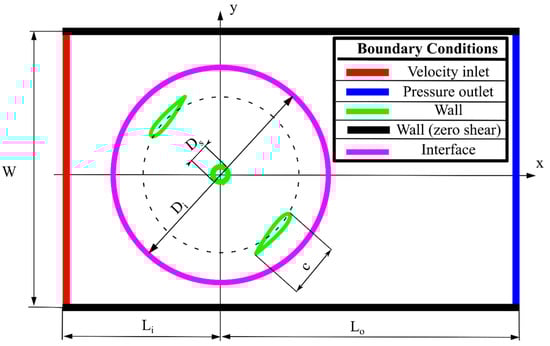 The rotor of a wind turbine consisted of blades and a shaft is surrounded by a rectangular area—a computing domain whose width corresponds to the width of the wind tunnel, W=6.6 m. Because the transient flow was considered, the sliding mesh technique was utilized. Using this technique requires specifying an additional area that will move along with the examined object during simulation. In these studies, a surface with a diameter of Di = 2 m was created that surrounded the rotor. During simulation, data is transferred between areas via the interface. The remaining dimensions are assumed: distance between the rotor axis and the inlet, Li = 6 m, and distance between the rotor axis and the outlet, Lo = 14 m. The influence of the diameters Di, Li and Lo on the performance of the wind turbine has not been studied in this work. A non-slip wall boundary condition was applied at the airfoil and shaft edges. In order to model smooth side walls of the wind tunnel a slip-wall boundary condition is used by specifying zero shear stress. The dimensions of the computational domain and boundary conditions are shown in Figure 3.
