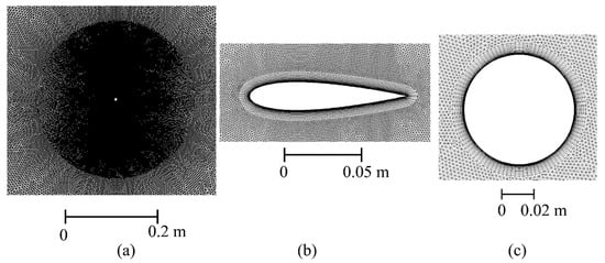 Grid distribution. (a) Mesh density in the rotor area; (b) Mesh around the blade; (c) Grid near the rotating shaft.