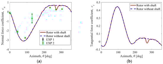 Figure 5a,b show two components of the aerodynamic force, normal and tangential respectively. The results are presented for the rotor consisting of two blades and for the rotor equipped with blades and a shaft. Only the results of the normal force component were compared to the experiment. The maximum value of the tangent component is seven times smaller in relation to the normal component. This creates enormous measurement problems, especially in the case of high tip speed ratios. Already in the 1970s and 1980s, this problem was reported, among others, by Strickland et al. [31] or Lanevile and Vittecoq [32]. The characteristics presented in the figures show an interesting effect, namely the influence of the shaft shadow is visible only in the vicinity of the azimuth angle θ=273 (deg). Aerodynamic characteristics for the upwind part of the rotor are almost identical; in the downwind region they are also very similar, but with the exception of the azimuthal location indicated in the previous sentence. From the engineering point of view, the local decrease in this tangential force causes a small loss of the rotor power coefficient, CP, from 0.411 to 0.401. The largest difference between numerical and experimental results was observed for the θ=130 (deg). The measurement error in this rotor position is also the largest. Numerical studies conducted by Rogowski et al. [33] with the use of a more advanced technique, Scale Adaptive Simulation (SAS), have shown that even for rotors operating in the range of optimal tip speed ratios, the effects typical for dynamic stall can be noticeable. They are, however, possible to detect by using more advanced techniques and using three-dimensional Navier–Stokes equations. Slightly higher results of the calculated normal force compared to the experimental results seem to be justified due to the fact that the analyzed model was two-dimensional, and the blade tip losses were not taken into account in this work. The influence of the rotating shaft in the experiment differs slightly from that obtained in the calculations. The normal force curve appears to be more flat in the downwind part of the rotor. The lack of a visible peak in the experimental curve of the normal force may result from 3D effects, which the two-dimensional numerical model did not include.