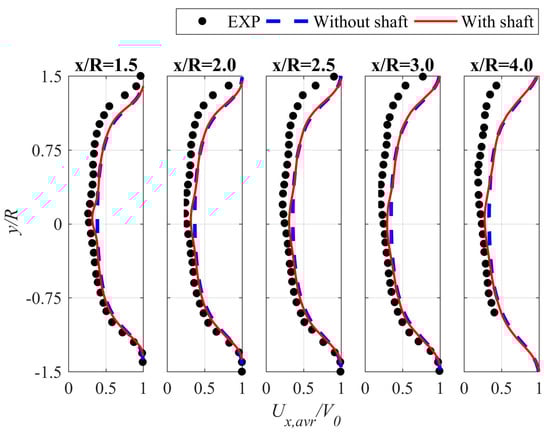 For y/R = 0.3 and x/R = 1.5, the influence of the shaft on the velocity profile is visible. With the increase in the ratio x/R, this effect gets smaller.