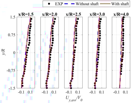 Velocity profiles Ux,avr calculated for both rotors differ slightly compared to experimental results (Figure 6). The differences are slightly lower in the case of the second velocity component, Uy,avr. These velocities are also related to wind speed, V0. The shapes of the dominant velocity component calculated numerically resemble the Gaussian curve while the velocity profiles measured in the experiment are asymmetrical. In this work, the influence of struts on rotor performance has not been studied. The struts are in fact profiled beams fixing the blades to the shaft. Each rotor blade is attached to the shaft by means of two struts. The struts can change the flow structure downstream behind the rotor and cause asymmetry of velocity profiles. Another possible factor that affects the differences in the calculated and measured velocity profiles may be the turbulence model used (the SST k-ω model).