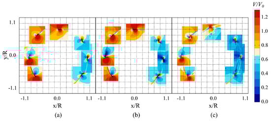 Contour maps of the magnitude velocity around one blade for seven azimuthal positions given for (a) the rotor without shaft; (b) the rotor with shaft; (c) PIV [27].