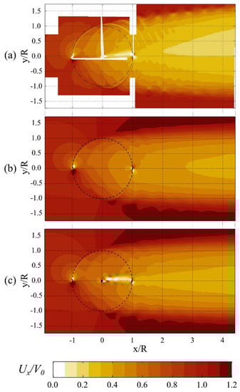 Contour maps of the Ux velocity component, shown for (a) PIV [26]; (b) the rotor without shaft; (c) the rotor with shaft.