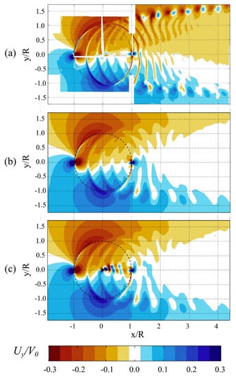 Contour maps of the Uy velocity component, shown for (a) PIV [26]; (b) the rotor without shaft; (c) the rotor with shaft.