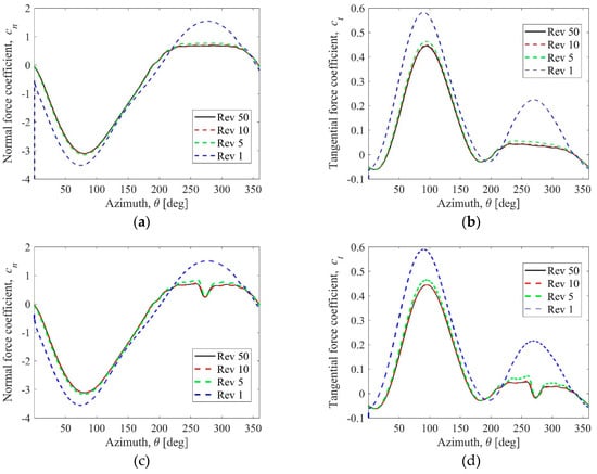 Aerodynamic forces for example rotor rotations. (a) Normal force coefficient for clean rotor; (b) Tangential force coefficient for clean rotor; (c) Normal force coefficient for the shafted rotor; (d) Tangential force coefficient for the shafted rotor.