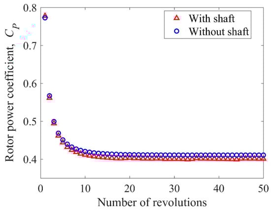 The product of the rotor torque coefficient, cm, averaged over the entire rotation of the rotor and the tip speed ratio is called the rotor power coefficient CP. This is an important physical quantity that allows to evaluate the aerodynamic efficiency of the wind turbine. Figure 13 shows the relation of the rotor power coefficient as a function of the number rotor revolutions simulated. It is worth noting that when the effect of initial conditions subsides, the power coefficient of the clean rotor is constant while in the case of a rotor with a shaft it is almost constant. The clean rotor achieves a power coefficient of 0.4109 while the shafted rotor of 0.401.