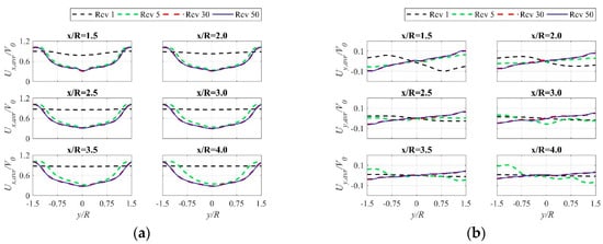 Averaged velocity profiles for different positions downstream behind the rotor for (a) Ux velocity component; (b) Uy velocity component.