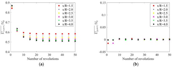 Figure 14a,b show the velocity profiles for six distances downstream behind the rotor and for four examples rotor rotations. It is clear from the presented drawings that the number of revolutions required for simulation depends on the distance from the rotor axis of rotation to the place where reliable results of the flow parameters are needed. In order to give the reader a clue about the number of necessary revolutions for his simulation, some additional analyses have been made. Velocity profiles for each x/R position were averaged in the y-axis direction, i.e., for y/R in the range of -1.5 to 1.5. The results obtained are shown in Figure 15a,b. Figure 15a clearly shows that the number of revolutions needed to obtain a reliable velocity profile is 10 for the position x/R = 1.5 and 20 for x/R = 4.0. This drawing is also valuable for one more reason. It shows that the velocity component parallel to the wind direction decreases along with the distance from the rotor axis of rotation, x/R. The average velocity along the profile x/R = 1.5 is 0.5832 and for x/R = 4.0 it is 0.5077. The rate of decreasing velocity is approximately linear. In the case of the second velocity component, its average values reach a value close to zero after 10 revolutions (Figure 15b).