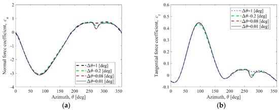 Influence of the time step size that corresponds to the angle step size Δθ on the aerodynamic blade loads: (a) normal and (b) tangential.