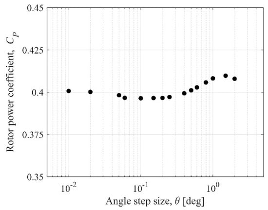 Influence of the time step size (the angle step size Δθ) on the rotor power coefficient.