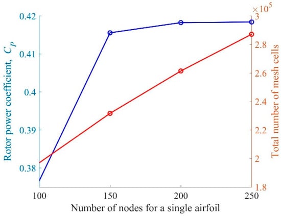 The last factor that was analyzed in this work is the influence of the numerical grid density on the solution. Due to the time-consuming nature of the calculations, only one grid parameter was examined—the number of grid nodes on the profile edges. For the coarse grid, the number of identical divisions at the airfoil edges was 100, and in the case of a fine mesh, the number of divisions was 250. Figure 18 proves that in order to obtain the power coefficient independent of the number od division of the airfoil edges this number should be minimum 200. The increase in the number of divisions, however, is associated with the increase in computational effort because the linear increase in the number of divisions do the airfoil edges results in a nearly linear increase in the total number of grid elements from 196,992 to 287,186.