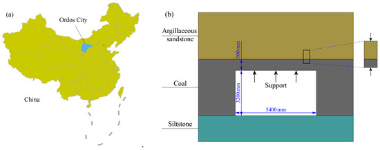 Geographic location of Ordos City and schematic diagram of test roadway: (a) geographic location of Ordos City; (b) schematic diagram of test roadway.