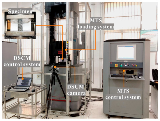 The test equation is presented in Figure 4. The MTS electro-hydraulic servo universal test machine (model C64.106/1000 kN) was used for loading. The test machine mainly comprises the control system and loading system. During the test, the force loading mode was used and the loading rate was 200 N/s. The testing machine had the following characteristics: high stiffness six-column load frame configuration, servo-controlled hydraulic actuation system, and standard double test space. The maximum loading pressure was 1000 kN.