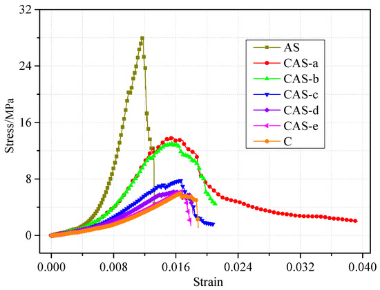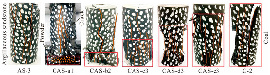Figure 9 shows the final failure pattern of the combination, when the tensile-shear failure of the combination occurred. The AS-3 specimen had many cracks running through the entire rock body. According to Section 3.2 and Section 3.3, the coal in the combination was destroyed first, and this caused the destruction of the entire specimen. According to failure pattern analysis, the combination failure mode was different. The coal–rock height ratio in the CAS-a1 specimen was 1:7, the coal height was extremely small, and the coal body was slowly extruded into a powder under pressure. The rock body formed a weak surface at the interface with a crack. The coal–rock height ratio of the CAS-b2 specimen was 1:3, the rock body was still the main carrier. The deformation generated during the loading process mainly came from the coal body. In the CAS-c3 specimen, the coal–rock height ratio was 1:1. Energy was released as the coal body destroyed, and this could have extended the cracks in the coal body to the rock mass. If the combined body did not undergo large deformation, the crack generated in the coal expanded into the rock body. Here, the rock body was destroyed, and the results revealed that the compressive strength of the combination was much smaller than that of specimens AS-3, CAS-a1, and CAS-b2. Specimens CAS-d3, CAS-e3, and C-2 had similar failure characteristics. The rock body was not the main bearing body, and did not destroy. The combination mainly exhibited coal characteristics, particularly with regard to the form of splitting failure.