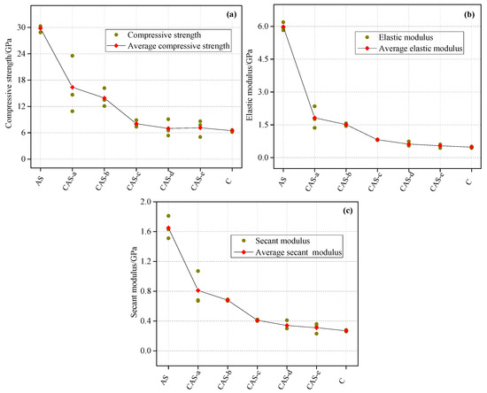 Mechanical properties of combinations with different coal–rock height ratios: (a) compressive strength and average compressive strength; (b) elastic modulus and average elastic modulus; (c) secant modulus and average secant modulus.