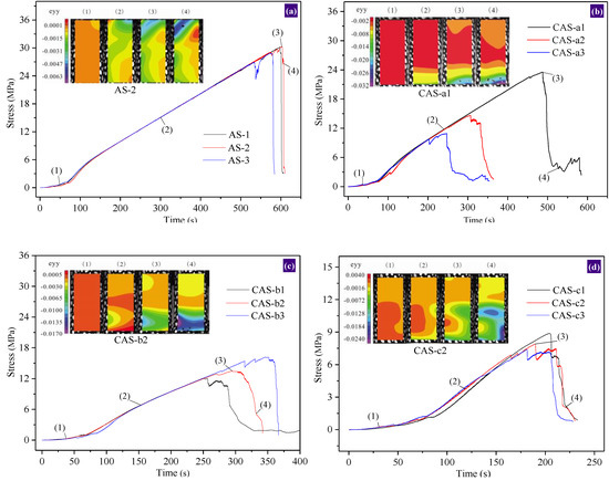Figure 7 shows the stress–strain characteristics of the coal–rock combination during the progressive failure. The curve represents the stress evolution with time, and can be divided into four phases: the compaction phase, elastic phase, yield phase, and post-peak phase. The typical composite samples were selected, and its strain field evolution in the compaction phase, elastic phase, yield phase, and post-peak phase was observed. The compressive strength law for combinations with different height ratio has been described above, thus, it will not be repeated in this section. The standard deviation of the compressive strength for a combination with a coal–rock height ratio of 0:1 and 1:0 was small, and the two curves were relatively consistent. Moreover, other combinations with the coal–rock height ratios of 1:7, 1:3, 1:1, 3:1, and 7:1 had a relatively large compressive strength standard deviation, and the compaction stage and elastic stage of each group were relatively similar. Moreover, the curves of the yield stage and post-peak stage were quite different, which is mainly attributed to the bearing performance difference caused by the different force locations in the combination.