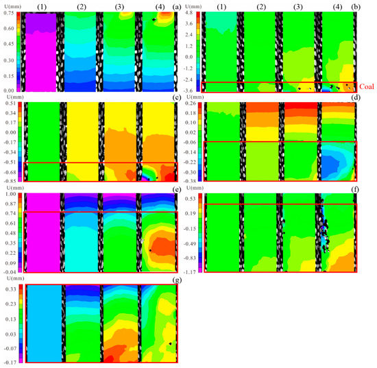 Evolution cloud map of lateral displacement field for combination: (a) AS-2, (b) CAS-a1, (c) CAS-b2, (d) CAS-c2, (e) CAS-d3, (f) CAS-e3, (g) C-2; (1), (2), (3), and (4) are the compaction stage, elastic stage, yield stage, and post-peak stage, respectively. Coal is inside the red box, and rock is outside of the red box. The negative value in the ruler indicates the direction to the left, while the positive value indicates the direction to the right.