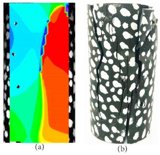 The DSCM measurement system was used to observe the surface non-contact during the process of combined failure, because it can accurately reflect the deformation and damage of specimens. Figure 10a shows the principal strain direction field cloud of the AS-3 specimen in the post-peak failure stage. As can be seen, the principal stress direction had obvious left–right differentiation. Thus, it was assessed that the specimen underwent tension–shear failure. The cloud map obtained by the measurement system was validated by the entity diagram shown in Figure 10b. Compared with the traditional strain gauge, the DSCM measurement system can observe the fracture evolution process of an entire specimen subjected to an external load, which is an obvious advantage.