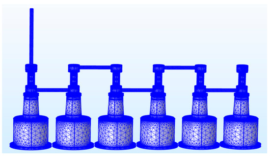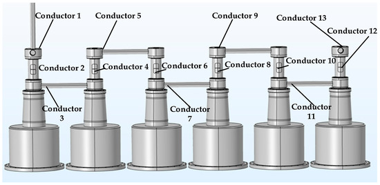 The commercial COMSOL software can easily obtain the distributed capacitance and extract a capacitance matrix by defining the conductors successively. As shown in Figure 5, all of the 13 conductors were defined, where the incoming busbar, the upper terminal of the first break, and the static contact were defined as conductor 1; the main shield, which is the floating potential, of the first VCB as conductor 2; the lower terminal of the first break, lower busbar, and the lower terminal of the second break as conductor 3; and so forth, and the exterior tank was grounded. Among the conductors, conductor 13 was composed of the last connecting terminal, last busbar, and outside tank. The capacitances between the moving contact and the static contact, and the capacitance between the conductor and the tank made a greater difference. Therefore, other stray capacitances between the conductors that were at a great distance from each other, such as the capacitance between the main shields of different VCBs, were ignored.