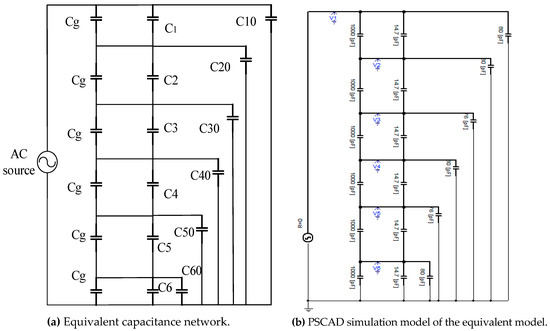 According to the calculated capacitance matrix, the stray capacitances to the earth were greater than the capacitance of the break of the VCB, which makes the voltage of each break unequal, indicating the need for a voltage sharing design. A grading capacitor was an effective and low-cost measure to balance the voltage of each break. To analyze the influence of the grading capacitor, the equivalent circuit model can be used. Figure 6a illustrates the equivalent capacitance network and the simulation model with a grading capacitor in PSCAD of the 363 kV VCB, where C1 was the capacitance between the moving contact and the static contact of the first break, and C10 was the capacitance between conductor 1 and the tank. Cg was the grading capacitor. The capacitance between the main shield and nearby conductors, which was very small, was attributed to the capacitance nearby to simplify the equivalent capacitor network under the criterion that the voltage of each break equals the results of the FEM simulation. Finally, parameters for the equivalent circuit simulation model were as follows: C1 = C2 = C3 = C4 = C5 = C6 = 14.7 pF; C20 = C40 = C60 = 80 pF; C30 = C50 = 76 pF.