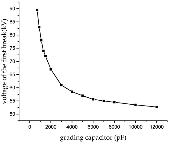 By assigning a different value to the grading capacitors, the change in the voltage of the first break along with the grading capacitors is shown in Figure 7. Table 4 shows the voltage variation of the first break at different grading capacitor values. The values of the grading capacitors were set in the range of 700 to 12,000 pF. The authors of [13] indicated that grading capacitors of 1000 pF can meet the opening requirements of a 126 kV triple-break VCB. However, for the 363 kV VCB, the first break shared 23.3% of the applied voltage when the grading capacitor was 1000 pF. When the grading capacitor was 6000 pF, the voltage distribution ratio of the six breaks from one to six was 18.4%, 17.5%, 16.3%, 15.9%, 15.5%, and 15.1%, respectively. The voltage distribution ratio of the first break was 3.2% higher than the sixth. Furthermore, when the grading capacitor exceeded 10,000 pF, the rate of improvement slowed down.