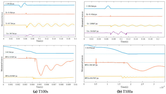 The prototype of the 363 kV sextuple-break VCB interrupted the short circuit current (symmetrical and asymmetrical) successfully in a high-voltage apparatus quality supervision and inspection test center as a preliminary research test. The key information is summarized in Table 5, and all recorded waveforms of the breaking current and the TRV are shown in Figure 9 and Figure 10. In Figure 9 and Figure 10, I is the test current, Ih is the small zero crossing current of synthetic test circuit, Ur is the total transient recovery voltage, Ucs is the voltage of the current source, HFUcs is the high-frequency voltage of the current source, and HFUr is the high-frequency transient recovery voltage. The recovery voltage is less than 258 kV and the TRV peak is less than 544 kV, which indicates that the grading capacitors of 10 nF can meet the requirement of the voltage sharing design and breaking capacity.