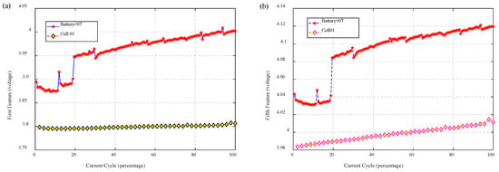 - To begin with, the complete degradation data of source battery and the previous parts of the target battery data are needed. Features are extracted from the raw data of charging voltage of batteries according to the scheme of IS. As is shown in Figure 4, the data in the middle and posterior parts, especially the latter part, have relatively large differences.
