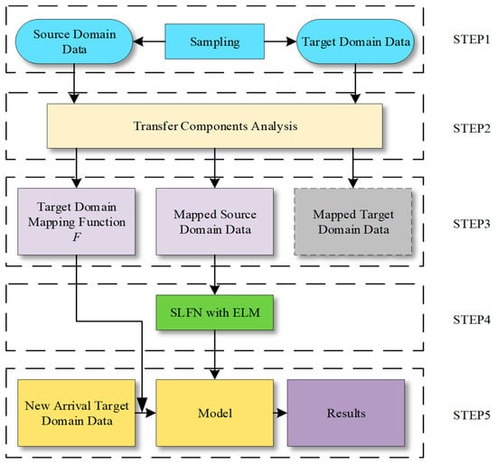 - The employment of the TCA algorithm is shown in this step. The calculation process of TCA is shown in Section 2.1. First, the input are two feature matrices from source and target domains. Then, calculate the L and H matrices according to Equation (5) and Equation (9). Then, we need to choose a kernel function to calculate the K matrix. In this paper, the Gaussian kernel function in the radial basis function (RBF) is chosen, for its lower computational cost and shorter computation time.where is the bandwidth of the Gaussian kernel function.Then, the ranked top dth eigenvalues of are the source and target domain data we need.